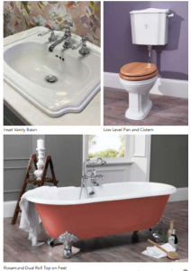 The traditional Balasani Low-Level Pan and Cistern coupled with a wooden seat provides an elegant and natural touch to any space, while a freestanding bath creates a dramatic focal point for any bathroom. The Rosamund Dual Roll Top cast iron bath is colour primed and is available in a variety of colours to match any scheme.