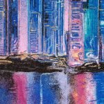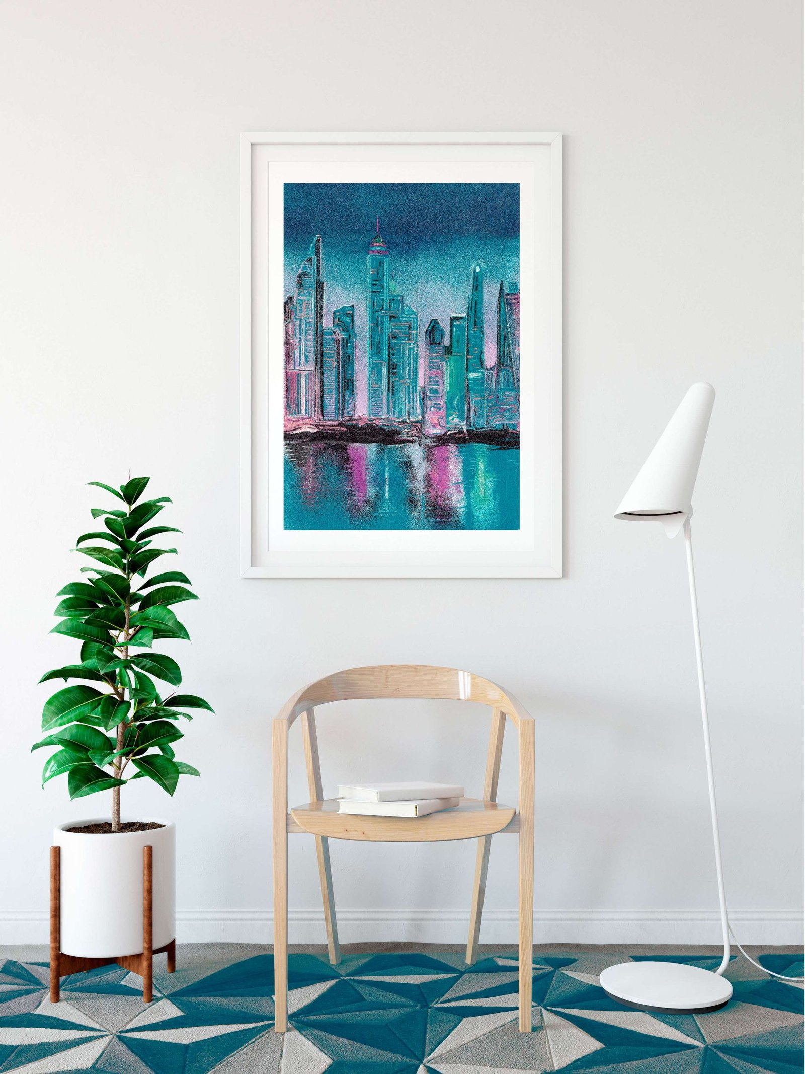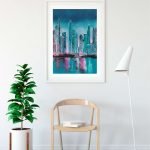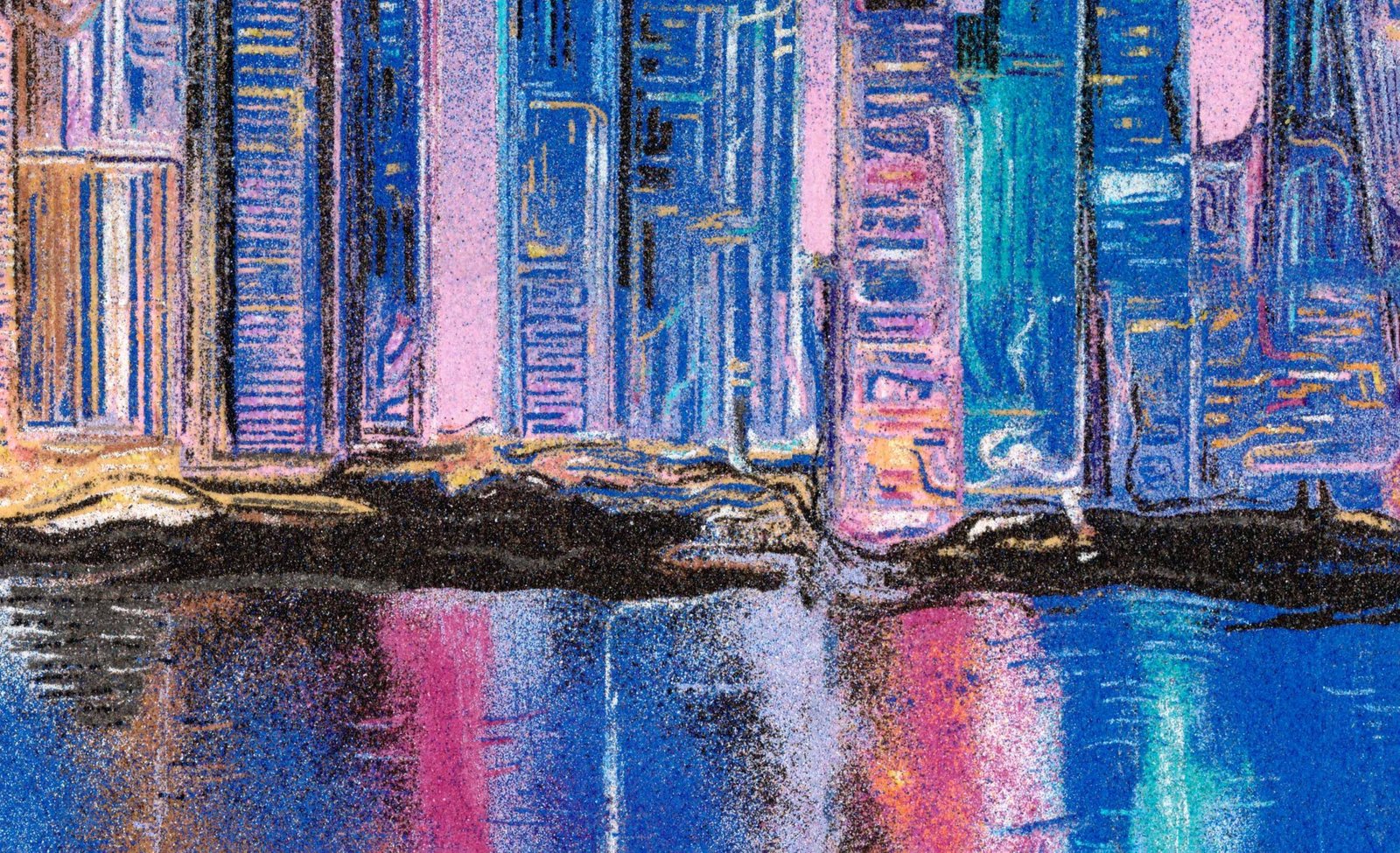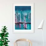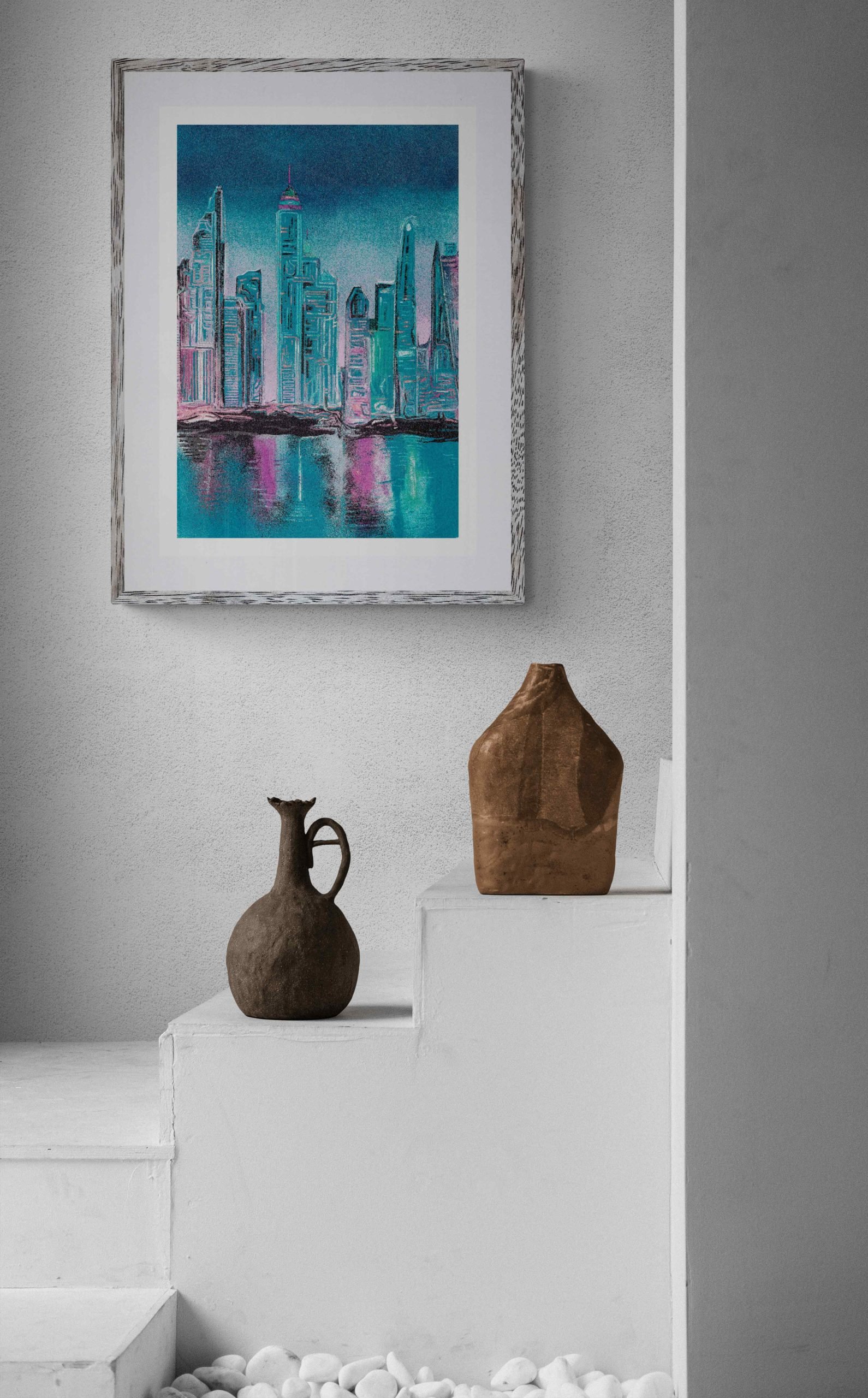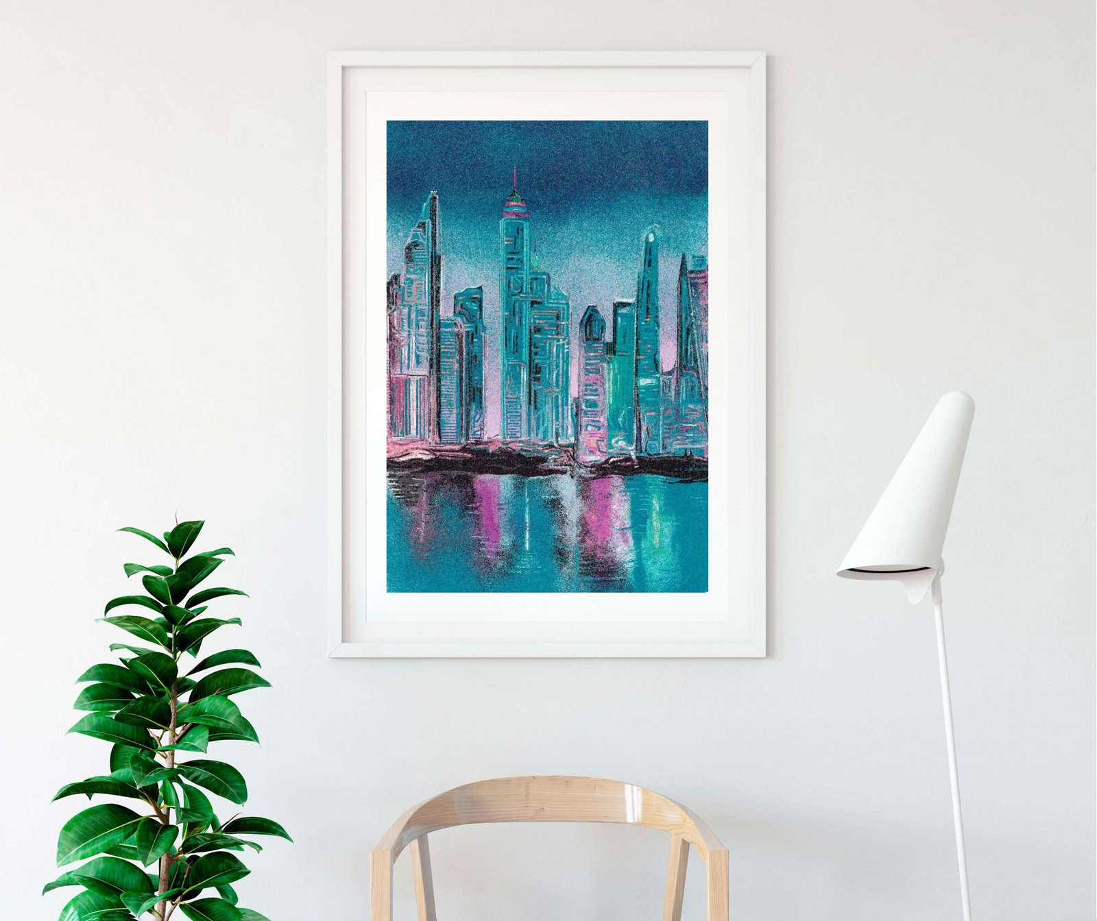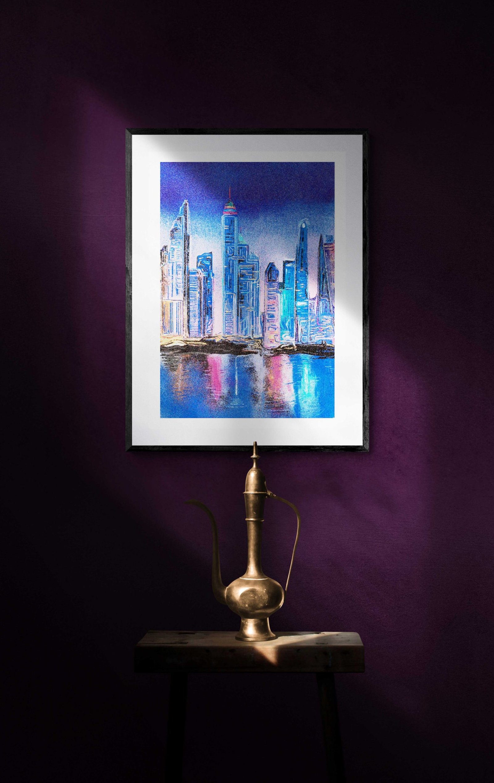 Art print of the Dubai Marina at night. Painted with coloured sand.