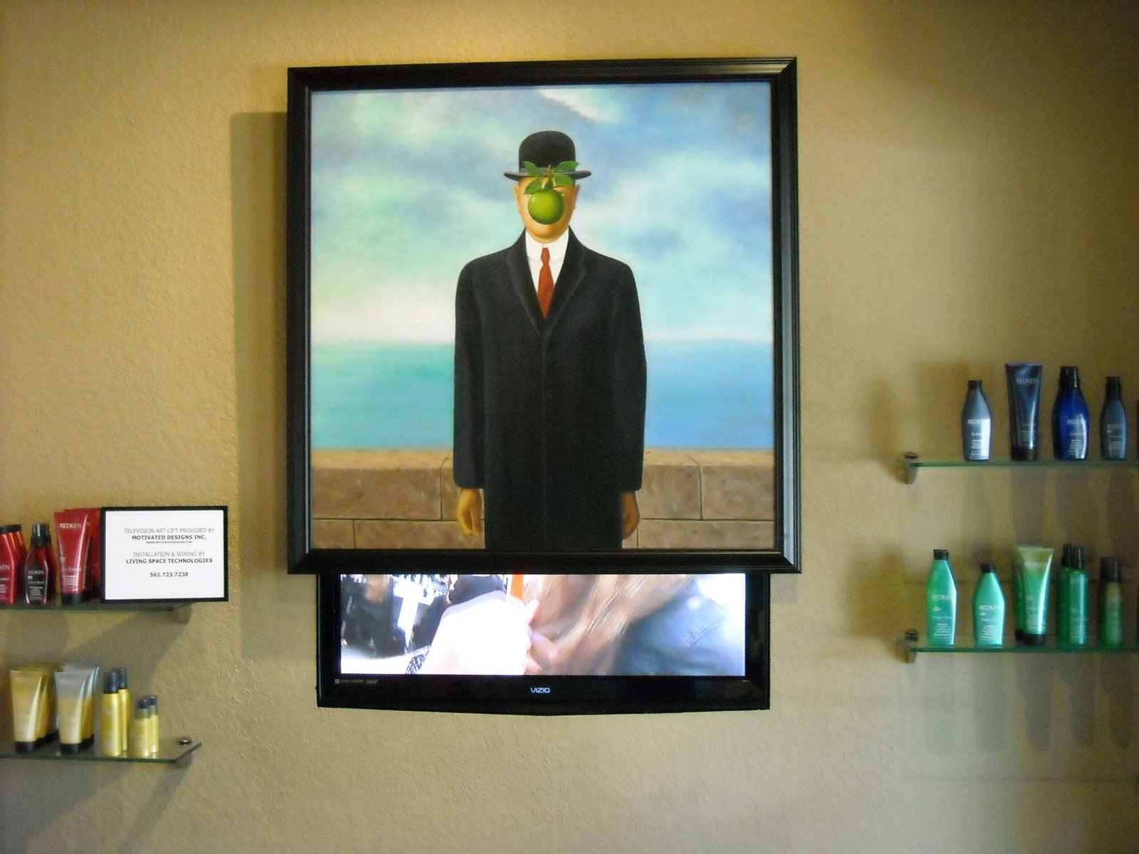 Nowadays, TVs are quite often mounted on a wall or recessed into a wall. Our Art/Panel Lifts offer a clever and elegant way to hide the TV when not in use. Our units allow you to use your artwork of choice that will raise or lower to expose or cover the TV.