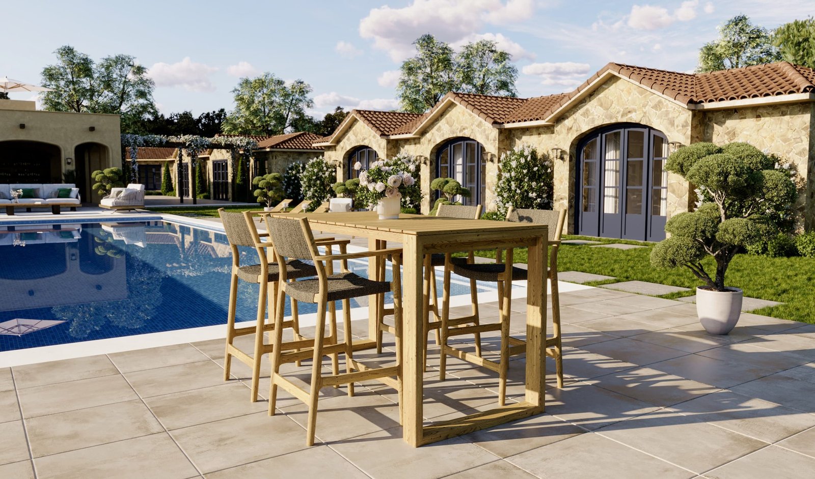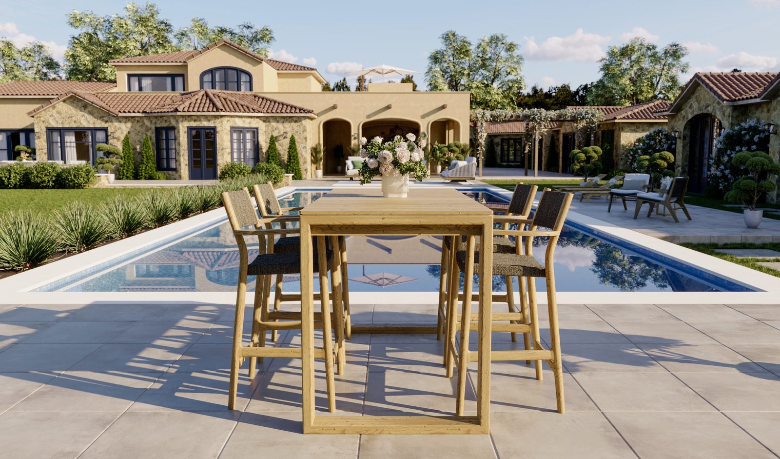 The Maddalena seating collection combines timeless elegance with practical functionality. Available in teak and rope in the color walnut, this collection offers both style and durability for any outdoor space. The Maddalena arm chair (59 x 59 x 83 cm) features a seamless transition from the front legs to the armrests, adding a Scandinavian touch to its design. Stackable for convenience, it blends classic aesthetics with modern practicality, making it perfect for both dining and lounging. The Maddalena bar stool (59 x 50 x 98 cm) showcases smooth lines and a sophisticated silhouette, with a seating height of 60 cm. Designed for comfort and durability, it is the ideal addition to outdoor bars or high tables, elevating any setting with its refined charm.
