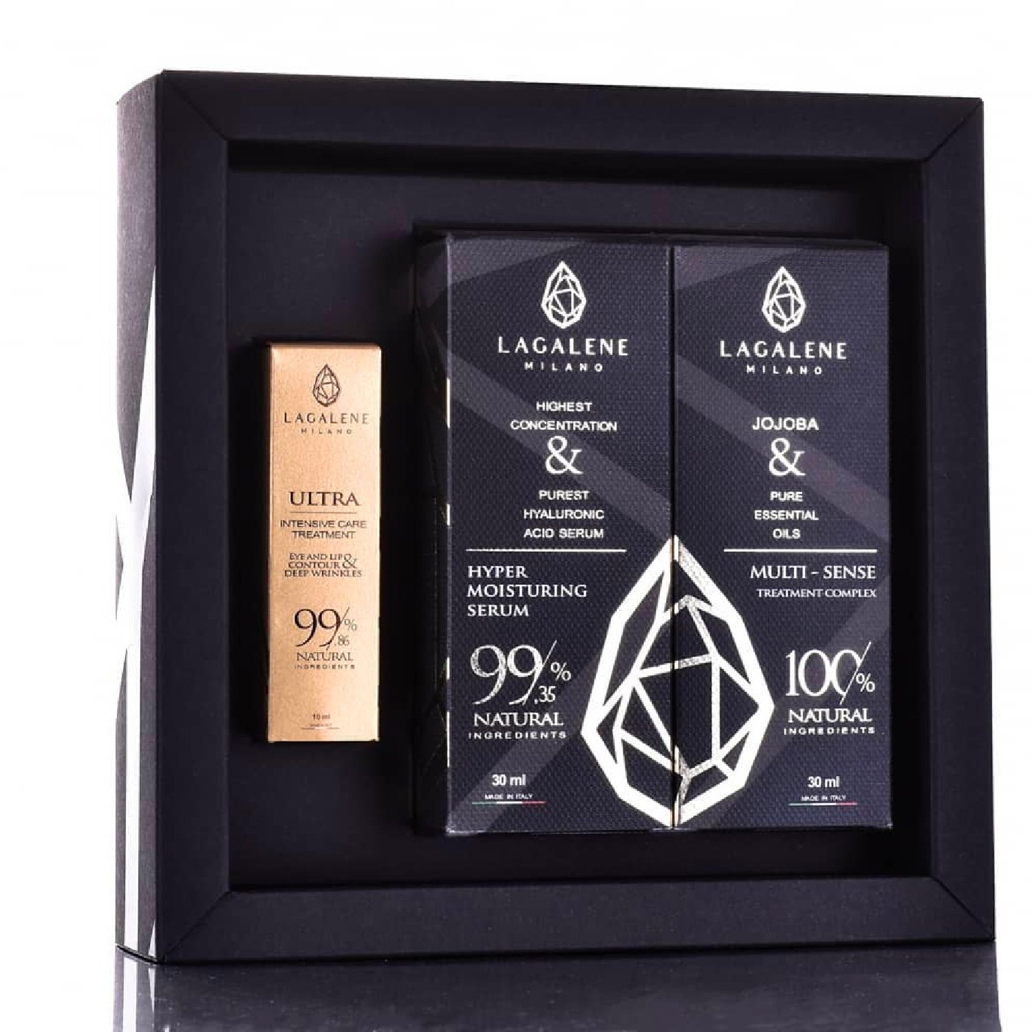 A complete beauty box for a highly effective treatment: natural, moisturizing, anti-aging, soothing, emollient, illuminating, draining, anti-blemish, anti-blemish and toning. This perfect beauty gift box contains Ultra Intensive Care Treatment 10ml, Hyper Moisturizing Serum 30ml, Multi-sense Treatment Complex