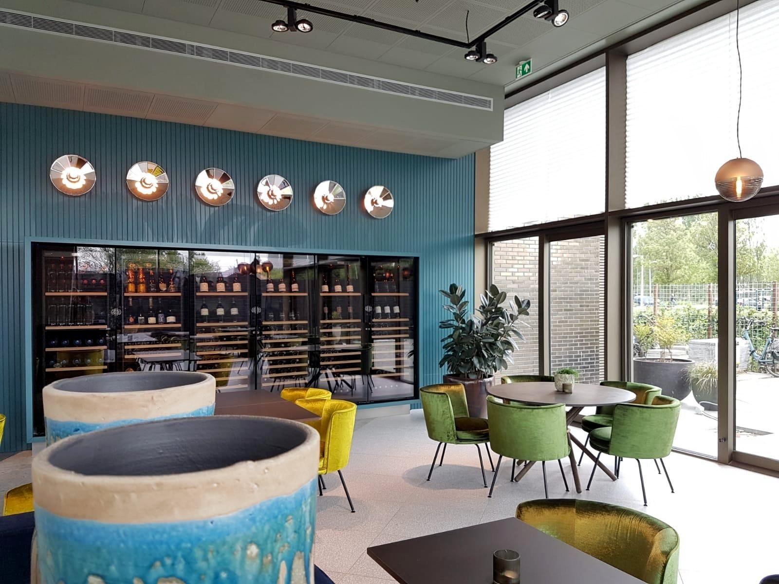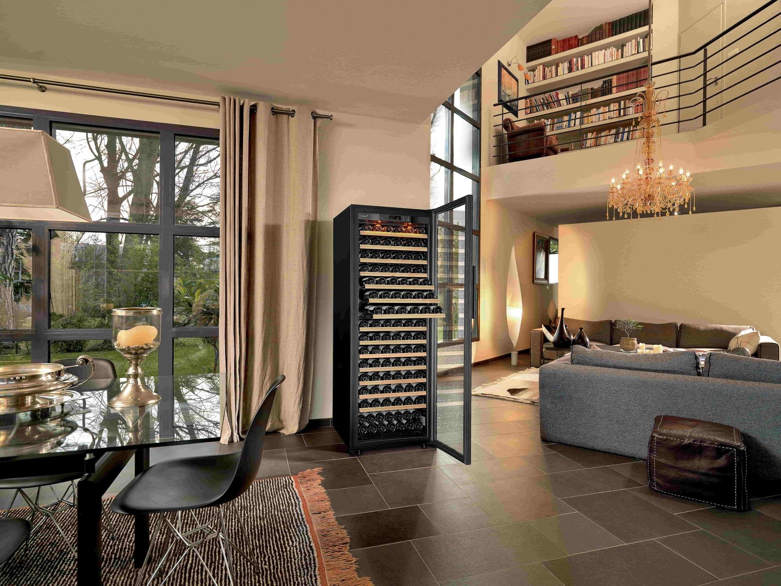 One core storage zone that can be adjusted from 9 to 15°C, one compartment for serving red wine that can be adjusted from 15 to 22°C, and one for cooling white wine, rosé, and champagne.