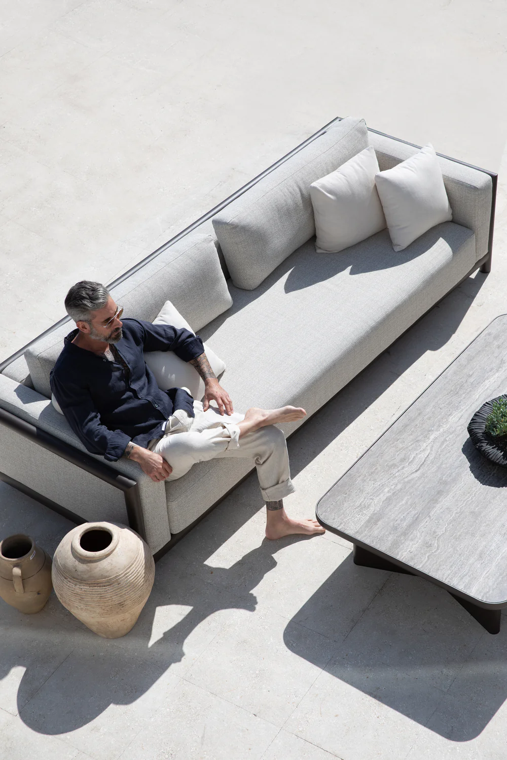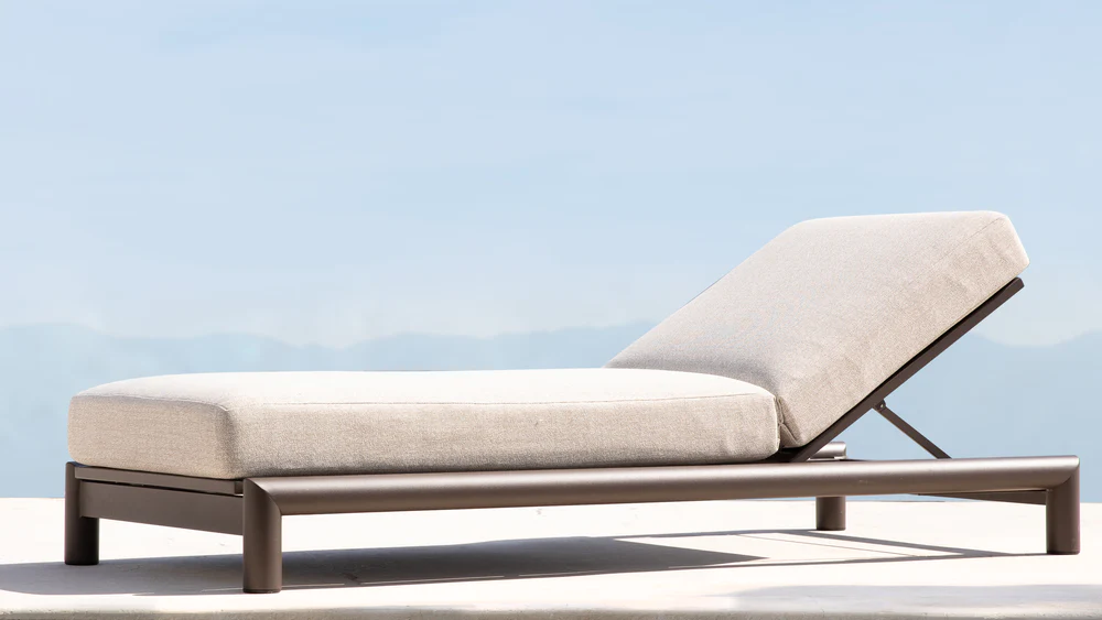 Our available stocked fabric is Siesta Slate. Milled in Italy as part of the One by Mario Sirtori line, Siesta is our premium fabric range and outdoor luxury at its finest. While it feels and looks like indoor linen, this double thickness basket–weave fabric is crafted from 100% polypropelene, making it resistant to sun, moisture, sweat, mildew and staining. Easy to clean and quick to dry, our latest outdoor fabric offering is refined, classic and contemporary. Slate is a melange of grey and charcoal fibers that adds depth and texture to your outdoor furniture.