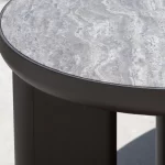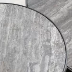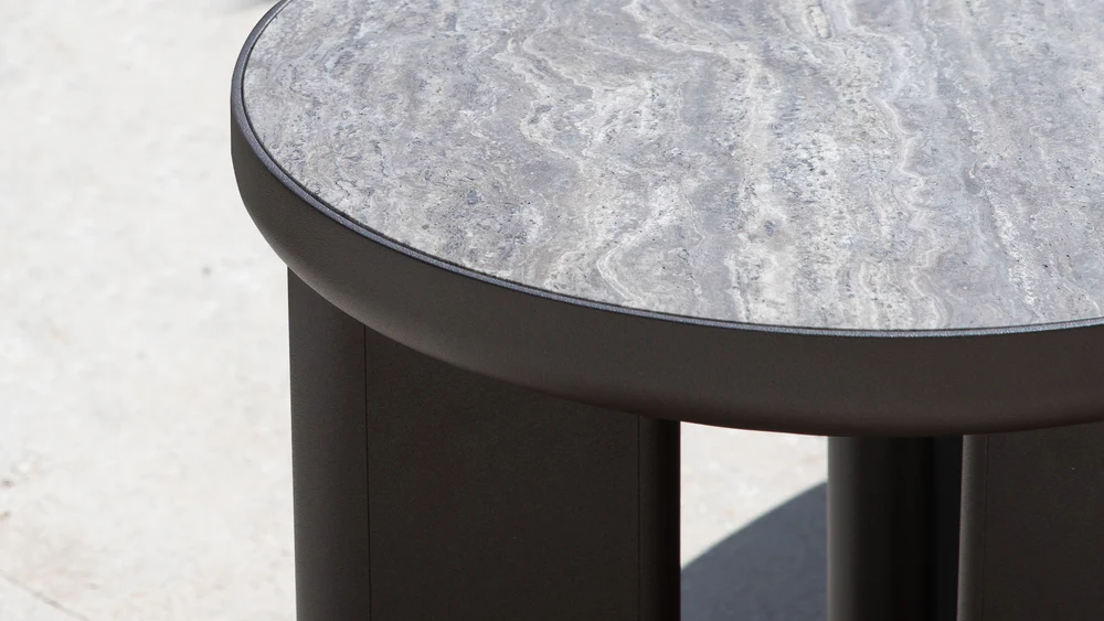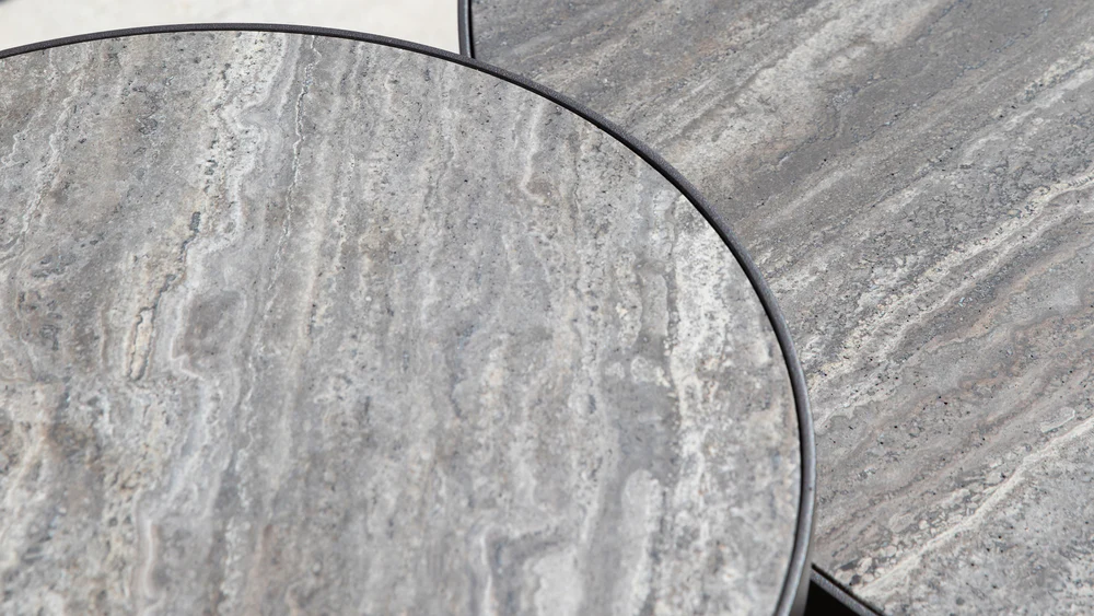 Grey travertine stone tops are set into a matching aluminum border on our Moab tables. A strong, organic contrasting material that intersects and interrupts strong aluminum elements.