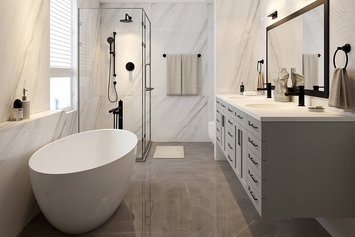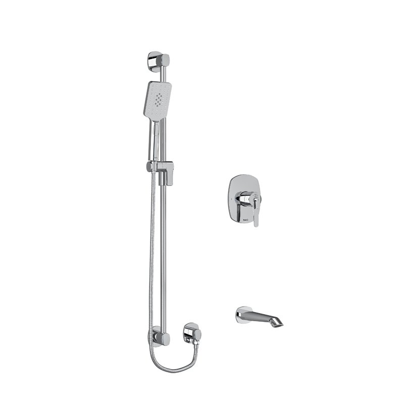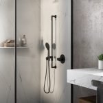 Riobel Presenting four unique collections, each reflecting Riobel’s distinctive design language, inspired by architecture with sculpted shapes and subtle details. The Parabola, Paradox , Venty and GS Collections feature co-coordinating brassware including two shower kits with thermostatic technology. Available in Chrome and Black finishes. Shower Kit 323 – Shower kit with shower rose and hand shower. The kit includes all components needed to create the perfect shower: rough, trim, multi-function hand shower and rail, shower arm and 20cm shower head. The thermostatic/pressure balance valve stabilises water temperature even in the event of a 50% drop in pressure. Shower Kit 1244 – Shower kit for over-bath installations. The kit includes all components needed to create the perfect shower: rough, trim, multi-function hand shower and rail, bath spout. The thermostatic/pressure balance valve stablises water temperature even in the event of a 50% drop in pressure.
