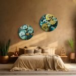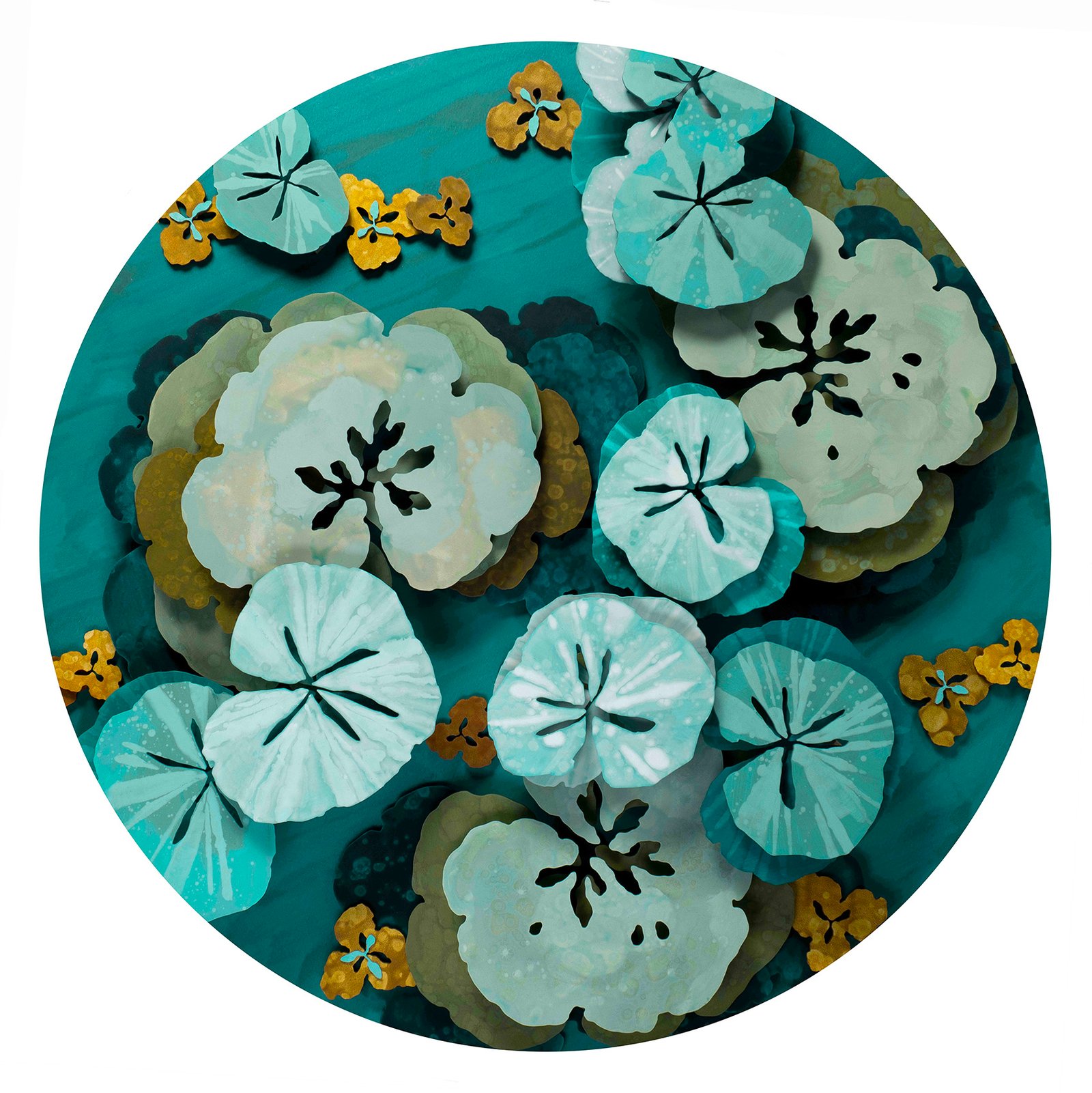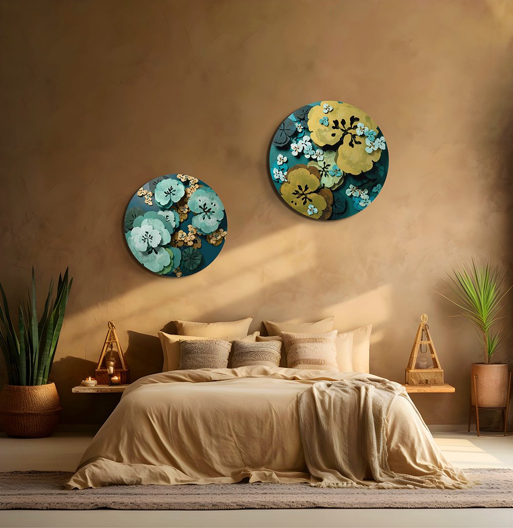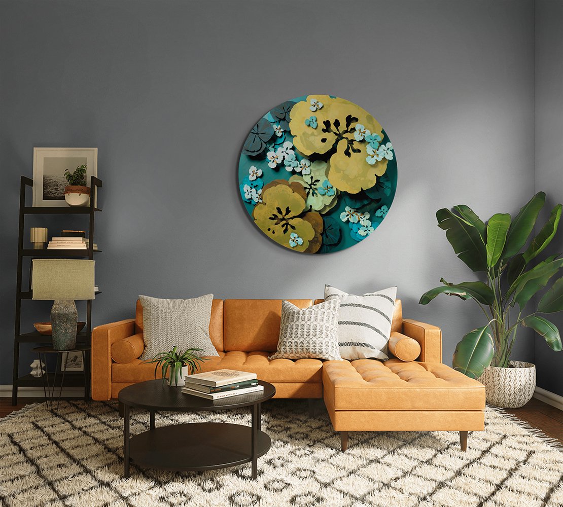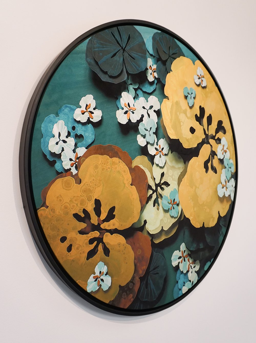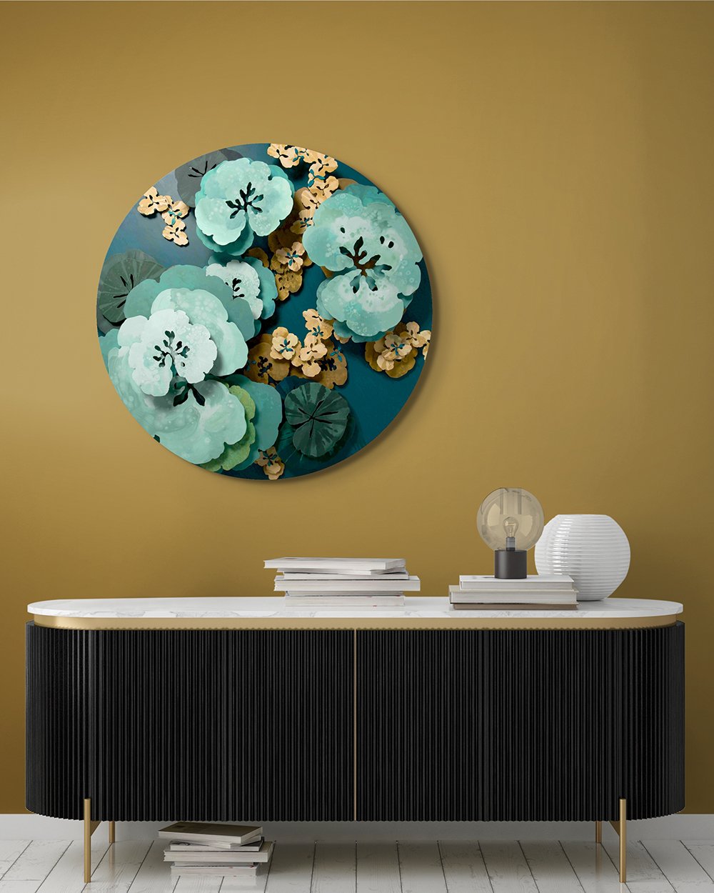 Velour-printed circular panels of photographed wall reliefs. In addition to my three-dimensional artwork, I've created a series of two-dimensional pieces with a trompe l’oeil effect. These compositions highlight BERM elements, captured with precise studio lighting to create a delicate interplay of shadows.