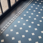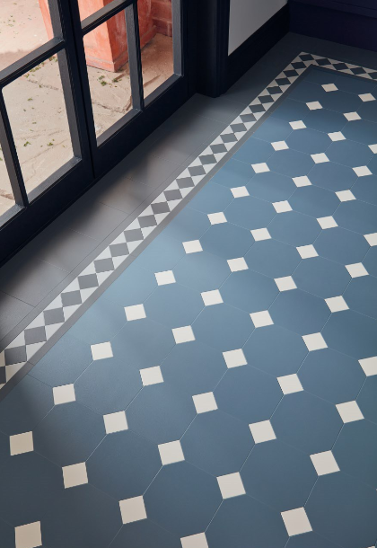 Neo-classical style mix of octagonal tiles with square insets in a contrasting shade. Compatible corners and borders available.