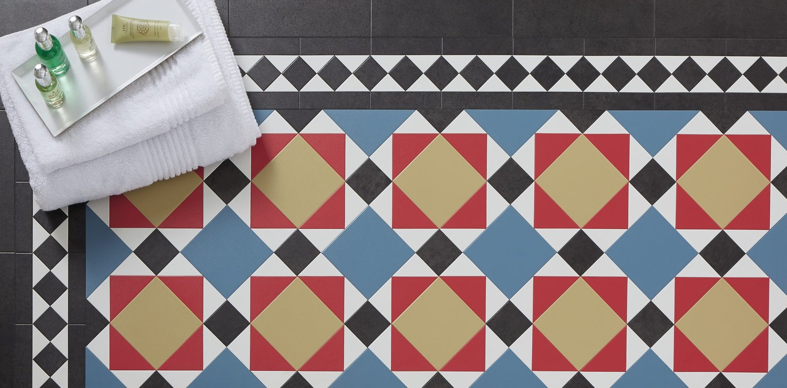 Combination of square and triangular tiles to create a star and square effect. Compatible corners and borders available.