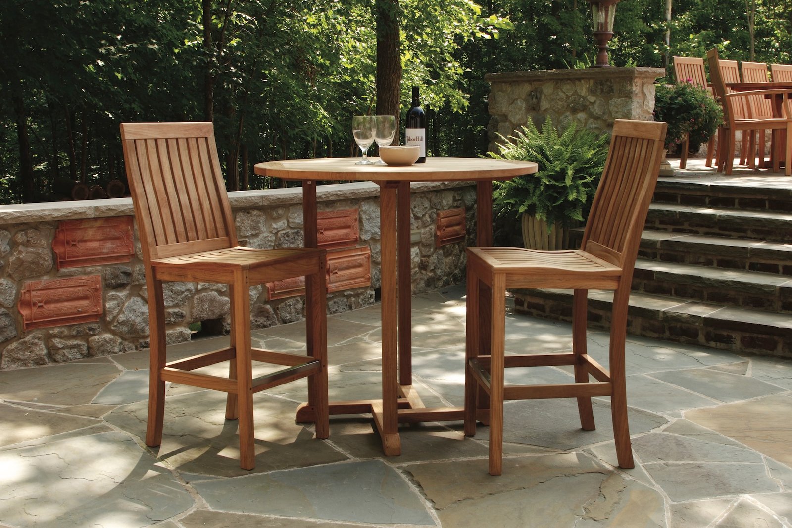 This larger bar height table offers generous surface space while maintaining a clean, classic look. Crafted from solid teak, it is ideal for outdoor bar areas, high top seating, or casual entertaining spaces.