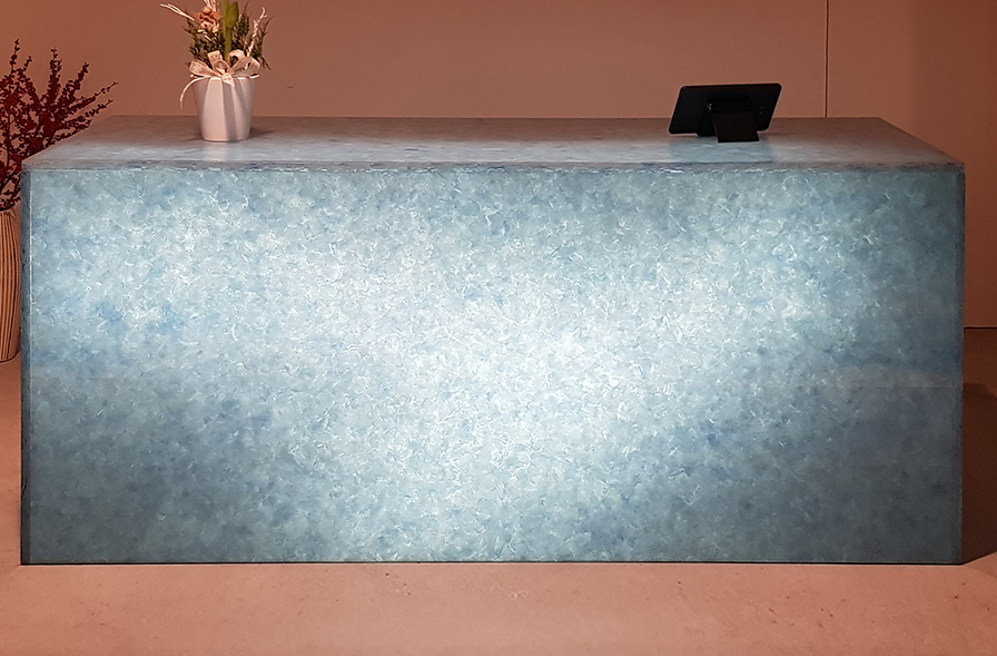 This product can be both cut from slabs to form bespoke installations of cladding, worktops and flooring and is also available in a range of finished products for furnishsing. Bespoke furnishing options are also available. Backlighting can be used to further enchance the beauty of the product.