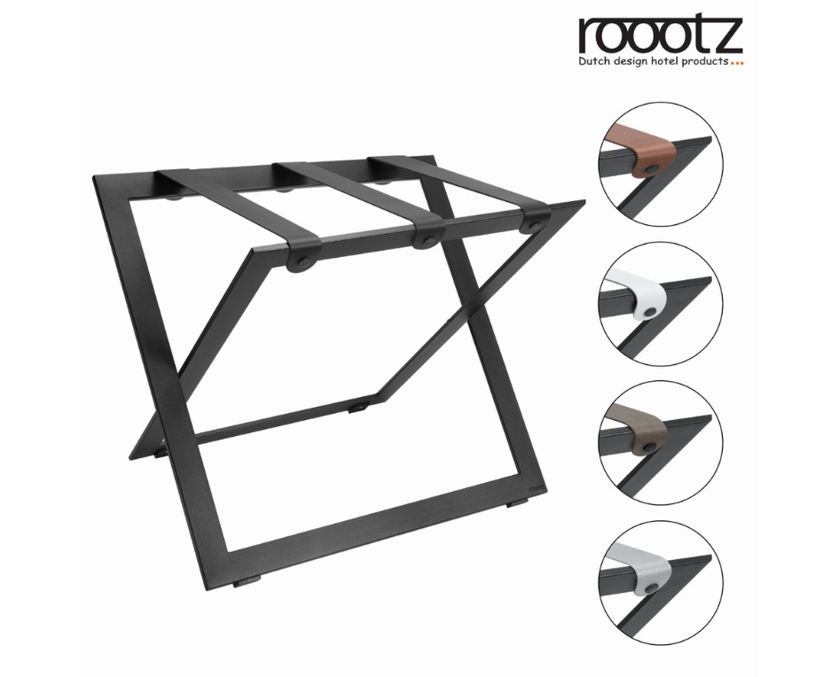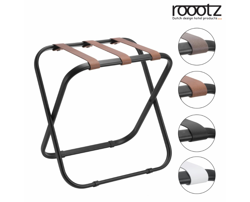The roootz COMPACT & TRAVELER luggage racks are available from stock with 6 different strap options. •Black, Brown, Grey and White Leather Straps •Black and Grey Nylon Straps