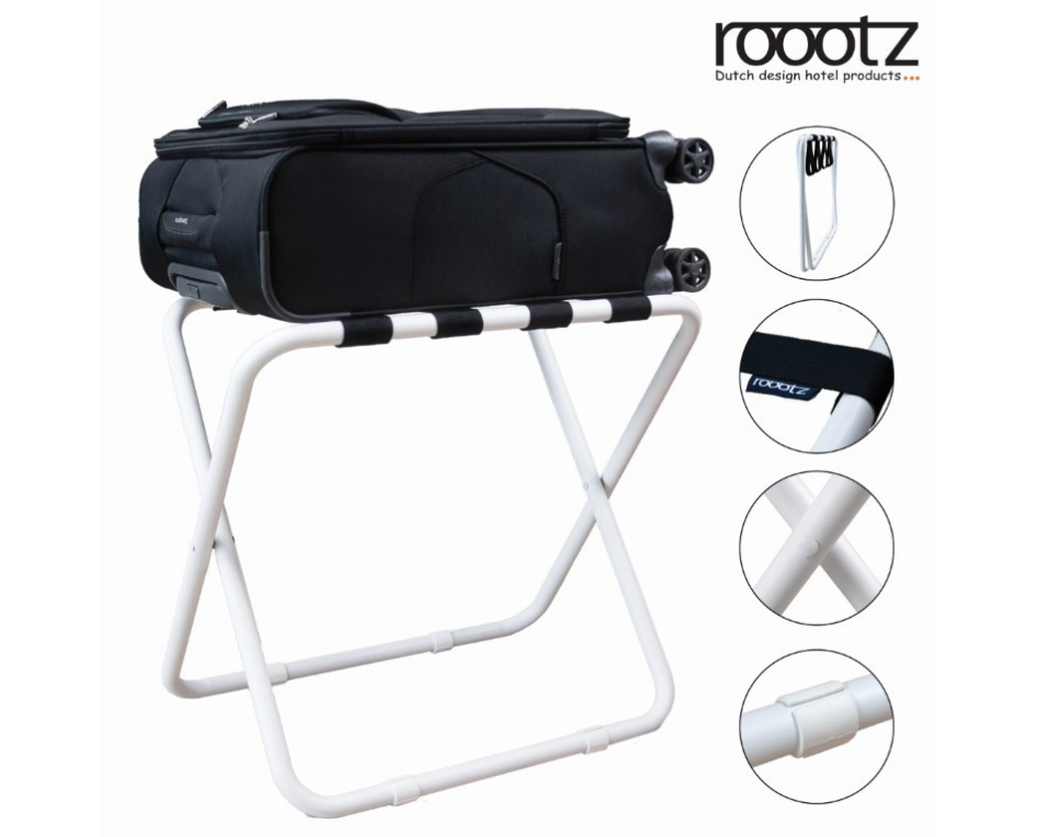 This luggage rack has an easy fold-up design. It is made of powder coated steel. This budget friendly luggage rack is available from stock in 3 different colours: White, Silver and Black.