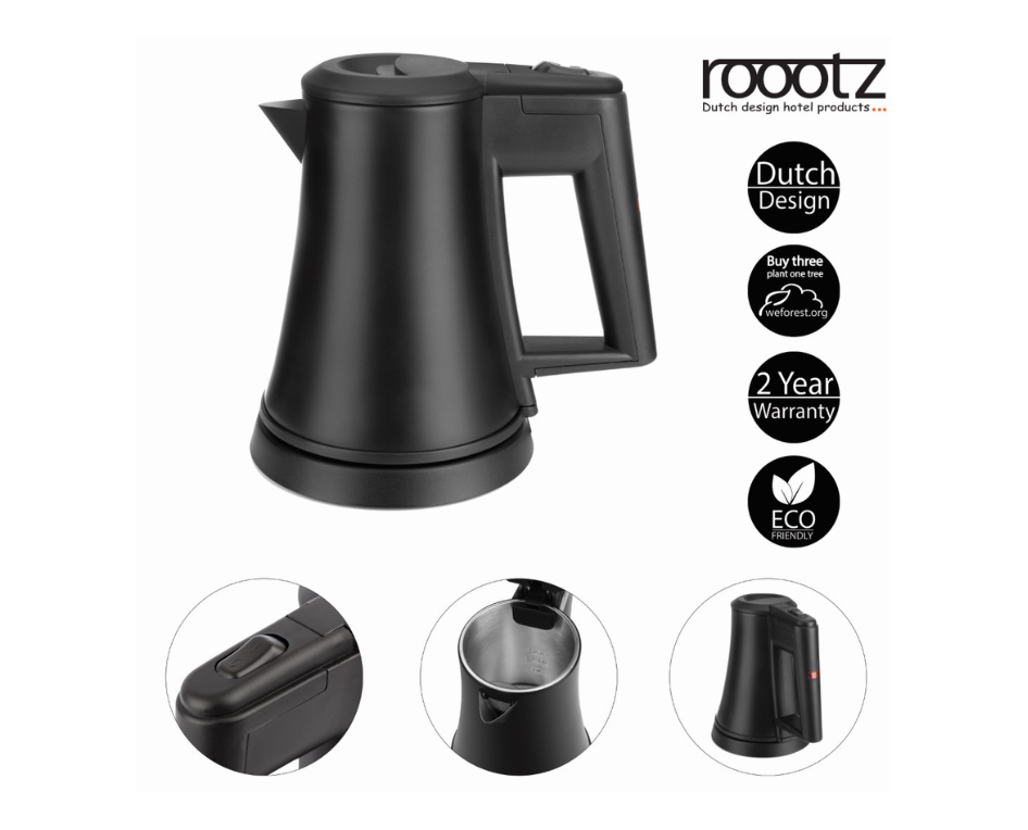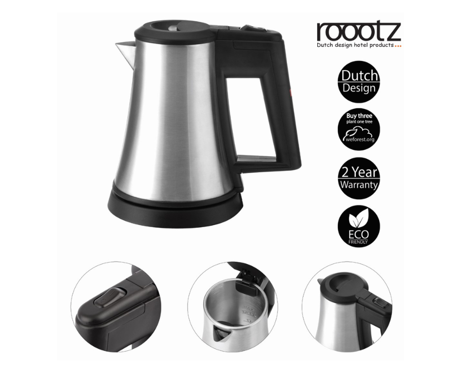 The roootz Base hotel kettle is made of 304 brushed stainless steel. The lid is easy to open and to replenish the water supply as needed. For extra safety, the automatic shut-off feature turns the kettle off when the water boils or if it’s accidentally powered on while empty. The kettle has a concealed heating element for easy cleaning.