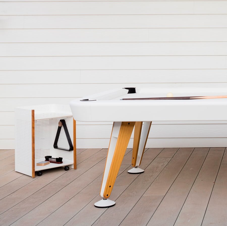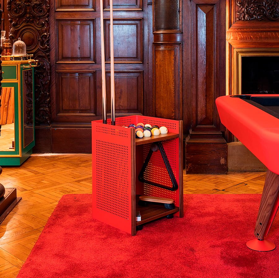 Mou and Diagonal play together as one. The Mou floor cue rack is the perfect mate for the Diagonal pool table. It keeps all your pool accessories safe in the same place. No more leaning pool cues against the wall. No more looking for chalk in every drawer. Each accessory has its own assigned space, and there’s even room for other items such as music or drinks, so your pool game can really be a chance to unwind, get away from it all, concentrate on something different, while enjoying some company and the challenge of the game.