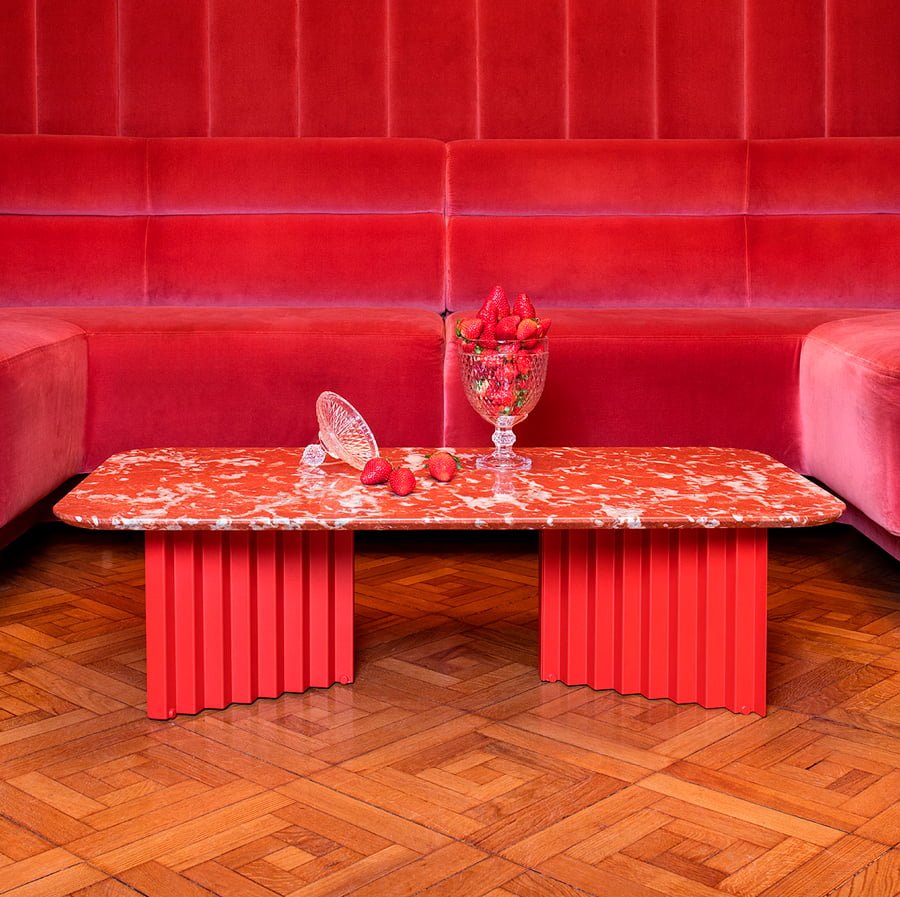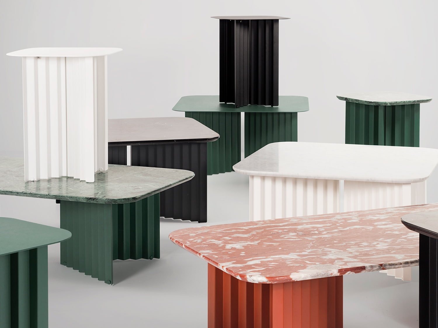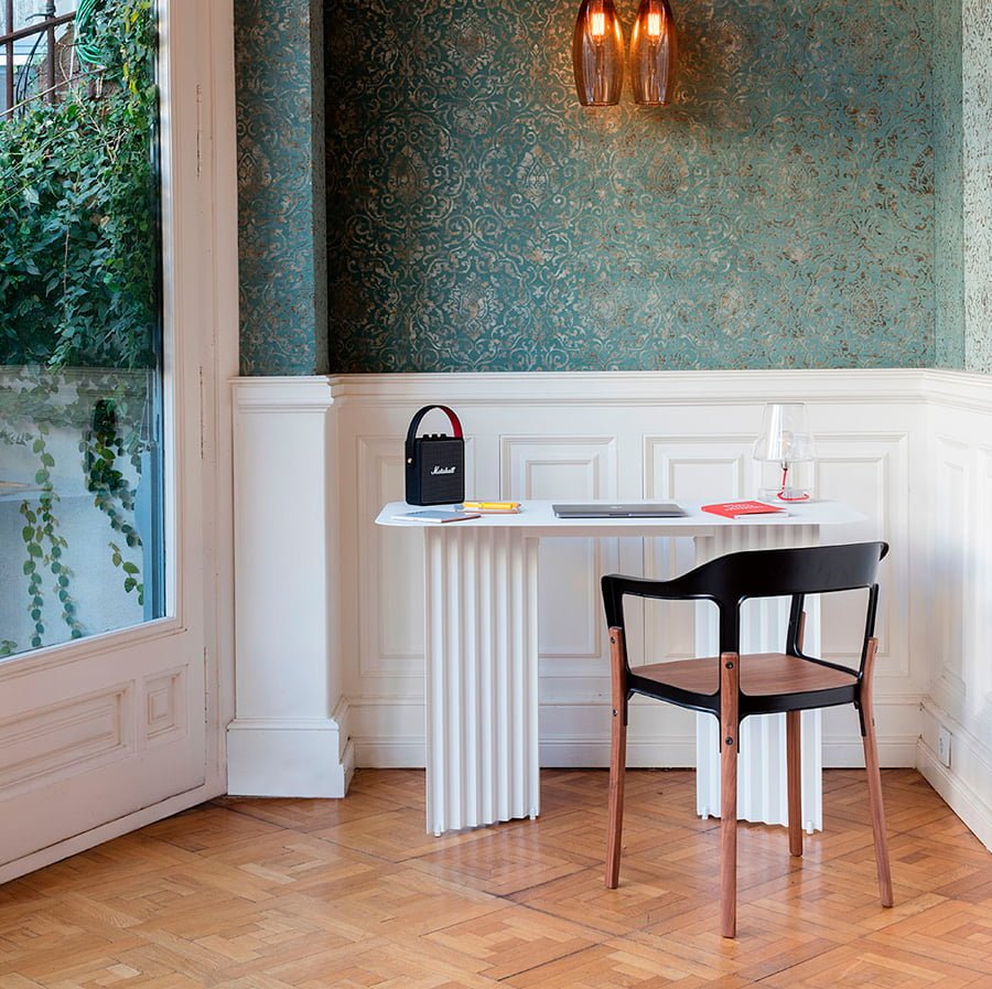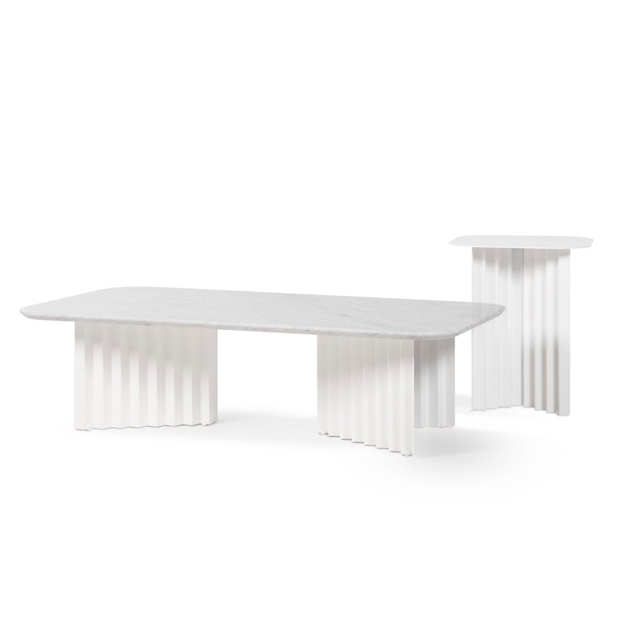 Plec is a collection of tables that are as happy together as they are apart. With their accordion-shaped legs, they love creating light and shade effects with their symmetrical folds and sensual colours. Their sculptural design, which might seem classical at first, proves capable of adapting to every atmosphere. Metal gives them an industrial feel, and marble, the elegance and authenticity. Colours confer personality and uniqueness. And with the combination of these elements, Plec reveals its savoir-faire. Quiet and restrained presence, without raising its voice, but uncovering the beauty of perfection. The Plec collection includes rectangular and round occasional tables, a desk and a pedestal.