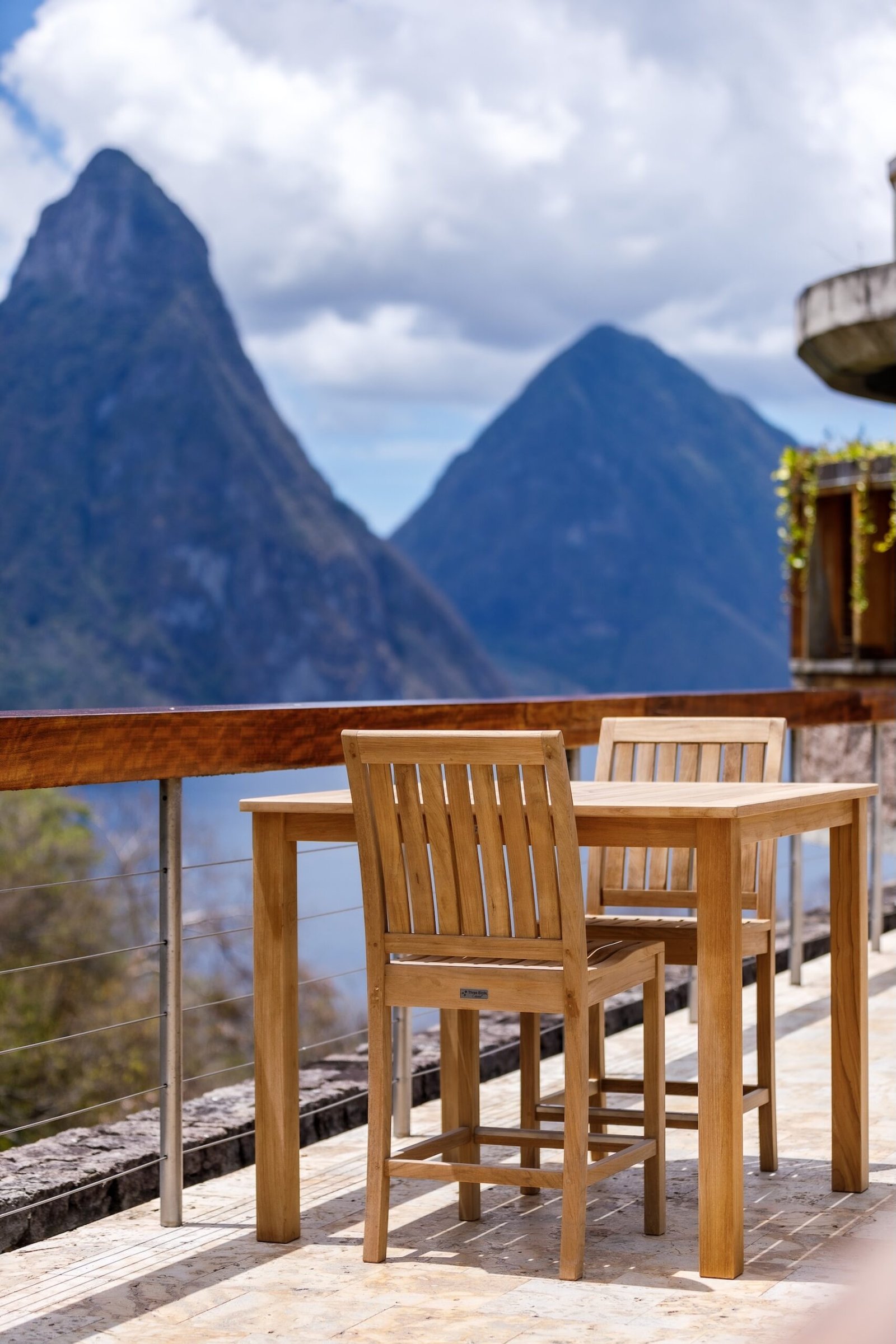 A refined bar height seating option featuring curved teak detailing and supportive armrests for enhanced comfort. Ideal for outdoor bar areas or elevated dining spaces, it blends ergonomic design with lasting durability.