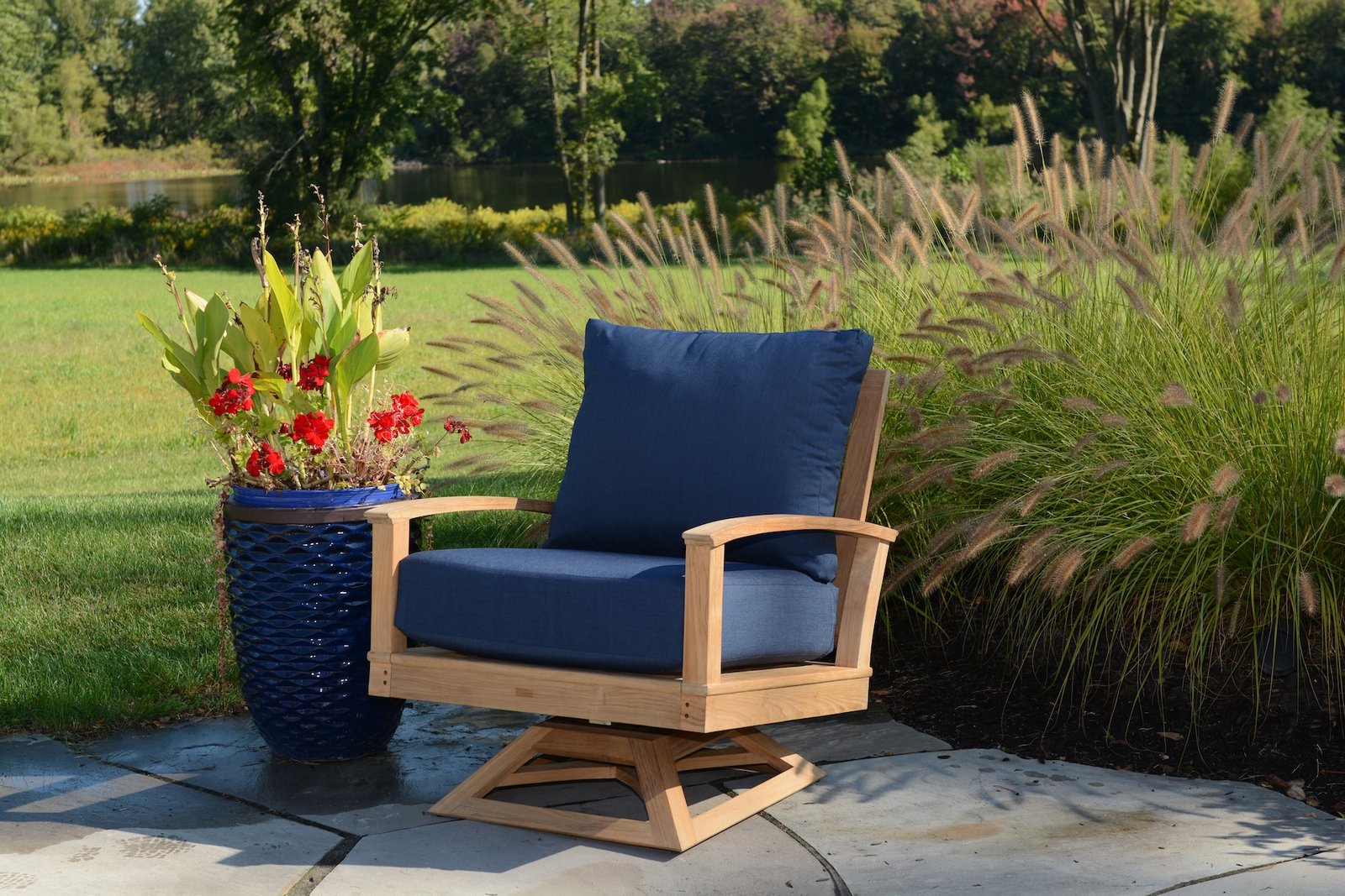 A comfortable deep seating lounge chair featuring smooth 360° swivel motion for effortless relaxation. Constructed from Grade A teak and paired with plush outdoor cushions, it’s ideal for patios, poolside lounges, or dynamic conversation areas.