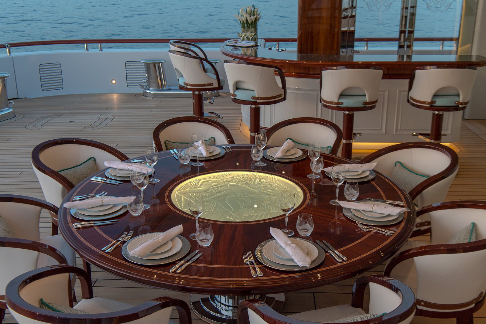 Production and design oversight are based in Germany, where Siebensee’s network of engineers, carpenters and upholstery experts craft furniture and bespoke pieces for international yacht projects.